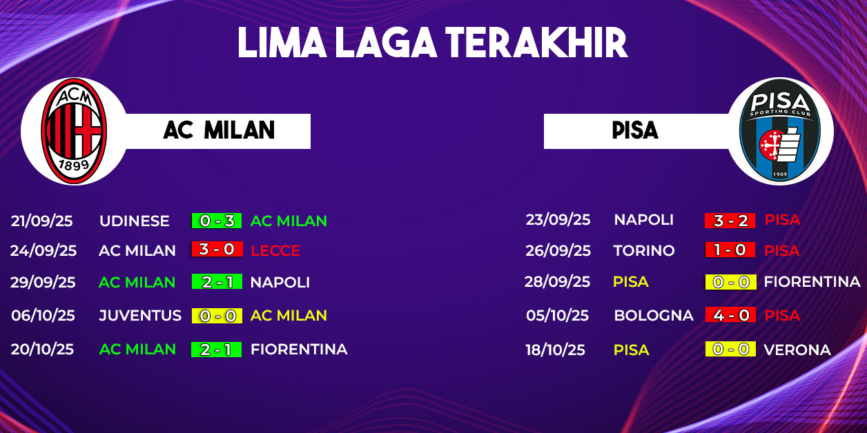 Pertandingan antara AC Milan vs Pisa pada 25 Oktober 2025 dipastikan menjadi salah satu laga yang menarik perhatian pecinta sepak bola Italia. Meski Pisa bukan tim papan atas Serie A, pertandingan ini tetap sarat gengsi karena AC Milan wajib meraih kemenangan demi menjaga posisi di klasemen. Berikut adalah prediksi lengkap AC Milan vs Pisa, meliputi performa terbaru, head-to-head, pemain kunci, hingga perkiraan skor akhir.