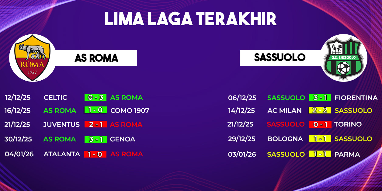Pertandingan Roma vs Sassuolo pada pekan ke-20 Serie A 2025-2026 akan digelar di Olimpico. Pertandingan Liga Italia ini dijadwalkan kick-off Minggu, 11 Januari 2026, jam 00.00 WIB, live streaming di Vidio.