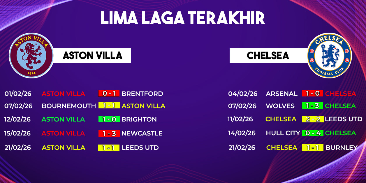 Berikut data pertemuan lima laga terakhir antara Aston Villa dan Chelsea yang menunjukkan keseimbangan kekuatan kedua tim: