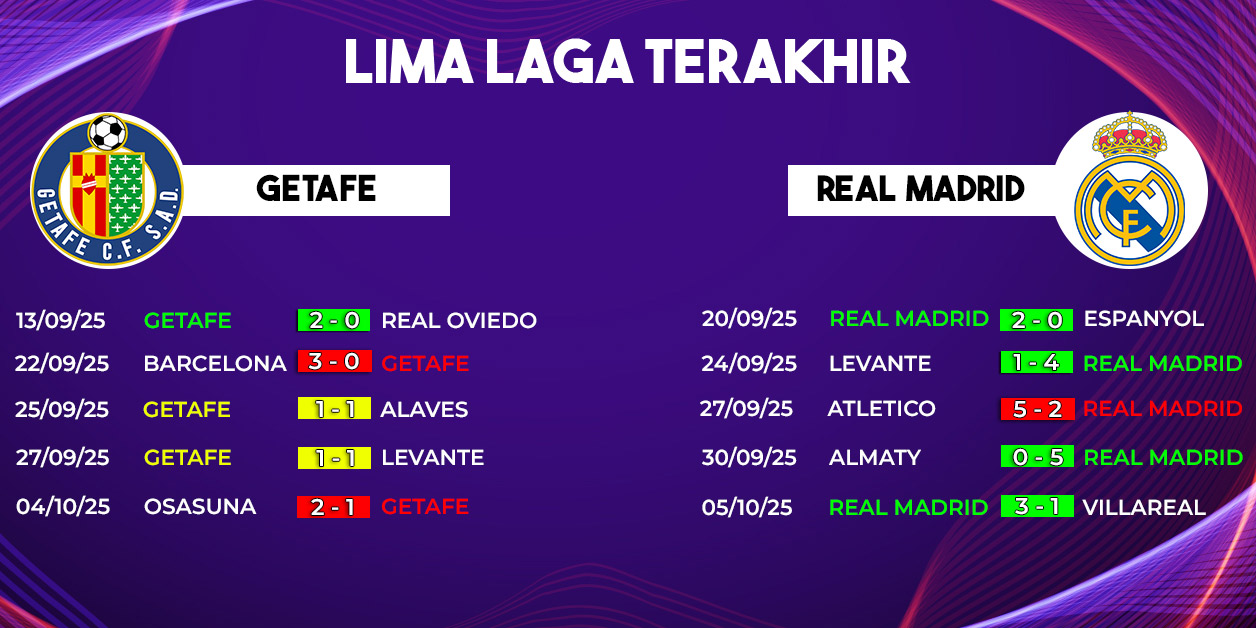 Melihat performa kedua tim, Real Madrid tetap diunggulkan meski bermain di markas lawan. Getafe bisa saja memberikan perlawanan sengit, namun secara kualitas dan konsistensi, Los Blancos masih berada di atas.