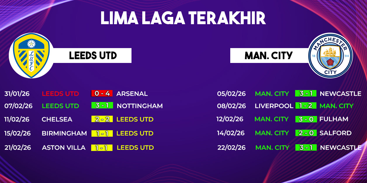 Dari data tersebut terlihat dominasi penuh Manchester City atas Leeds United dalam lima pertemuan terakhir. Produktivitas gol Manchester City sangat tinggi, bahkan sempat mencatat kemenangan besar dengan margin mencolok.