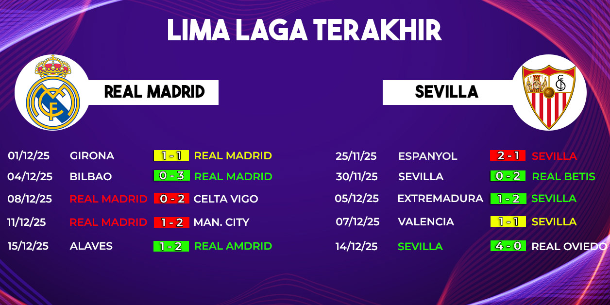 Di sisi lain, Sevilla datang ke Santiago Bernabeu dengan kondisi yang belum stabil. Tim asuhan Matias Almeyda menunjukkan performa yang inkonsisten sepanjang musim ini. Pada laga terakhir La Liga, Sevilla tampil impresif dengan kemenangan telak 4-0 atas Oviedo, hasil yang sempat mengangkat kepercayaan diri tim.
