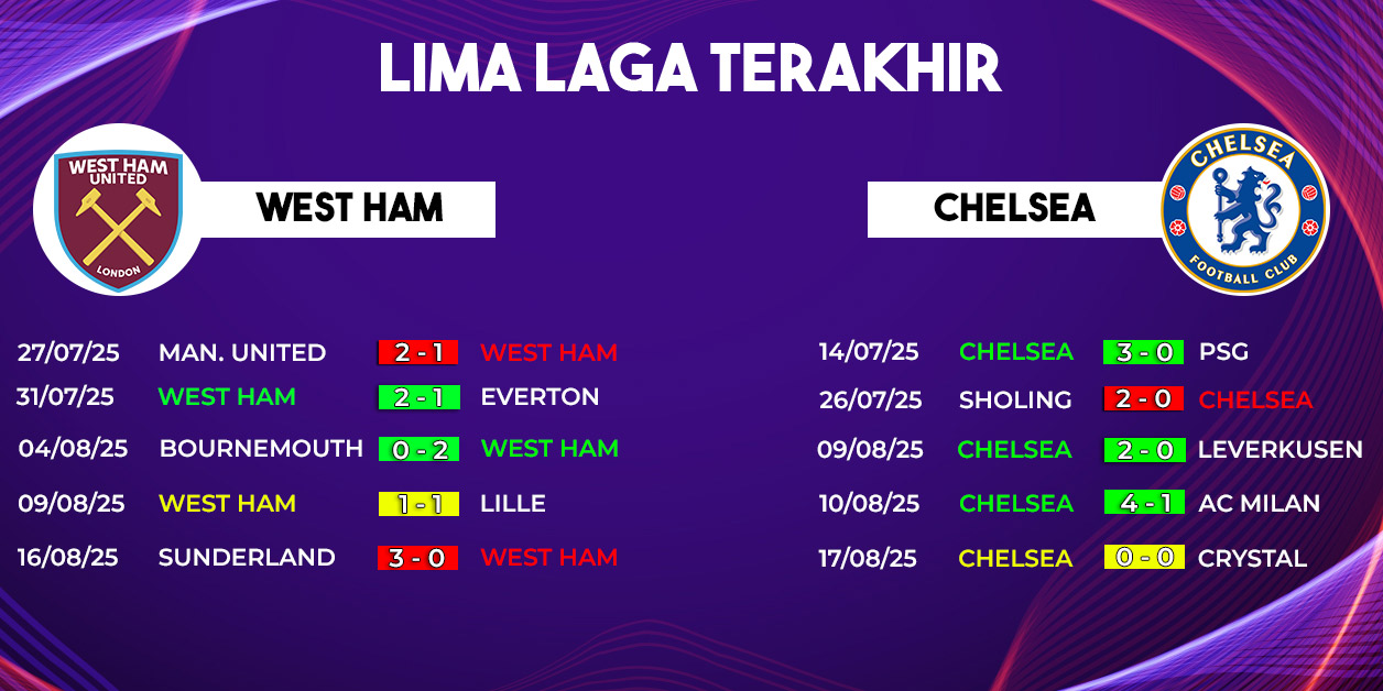 Dengan atmosfer derby London yang panas, laga West Ham vs Chelsea ini dipastikan menghadirkan pertarungan seru. Bagi Chelsea, kemenangan akan menjadi pembuktian awal bahwa mereka siap bersaing di Premier League 2025/2026. Sementara bagi West Ham, hasil positif bisa menjadi kunci untuk memulihkan kepercayaan fans terhadap Graham Potter.